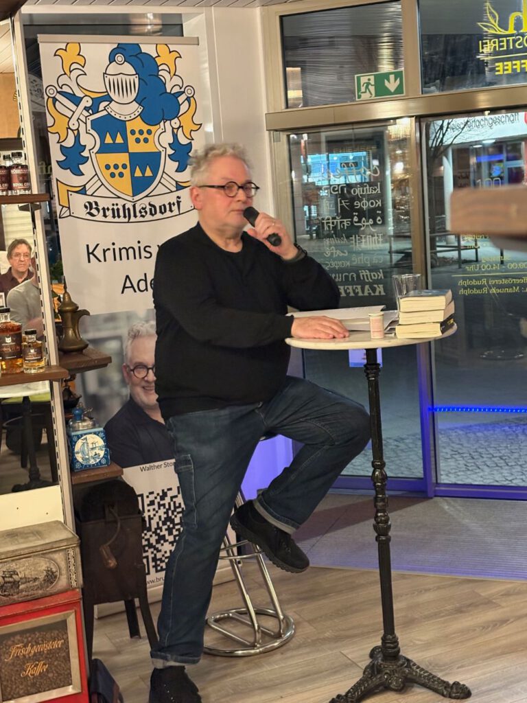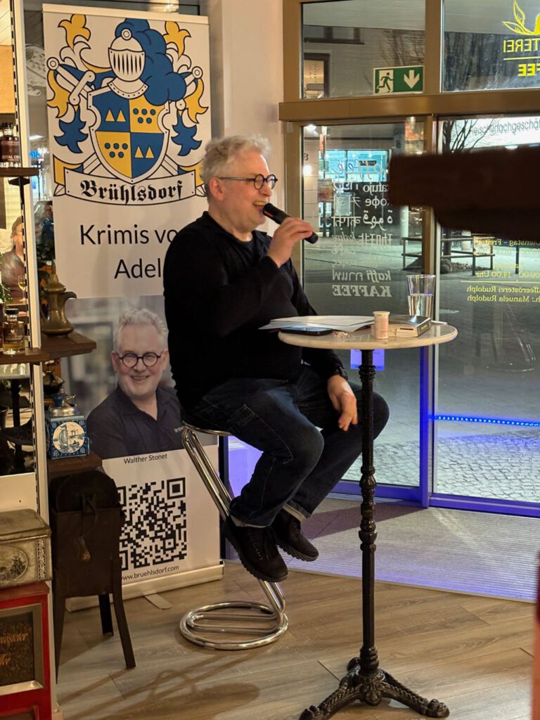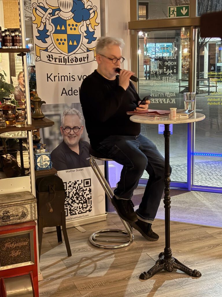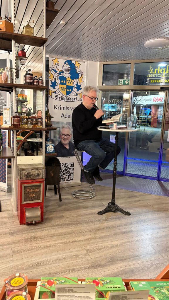 Die meisten Gäste hatten ihre Packung Brühlsdorf-Kaffee und ein Achtel des weißen Metzinger Bio-Cuvées vor sich, das sich hinter dem Brühlsdorf Weißen verbirgt. Eine spannende Tour durch die Dialekte Sächsisch, Schwäbisch und Oberbayrisch lockerten die Atmosphäre ebenso auf wie die gereimten Kurzkrimis der Kriminalsonette. Wie spannend der aktuelle Fall um drei Männerleichen ist, konnten die Anwesenden erahnen. Erfahren könnten sie es, wenn sie das Buch läsen, meinte der Autor augenzwinkernd.