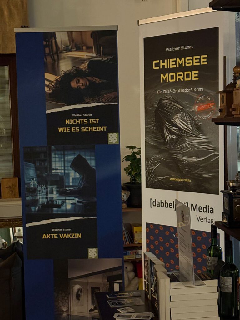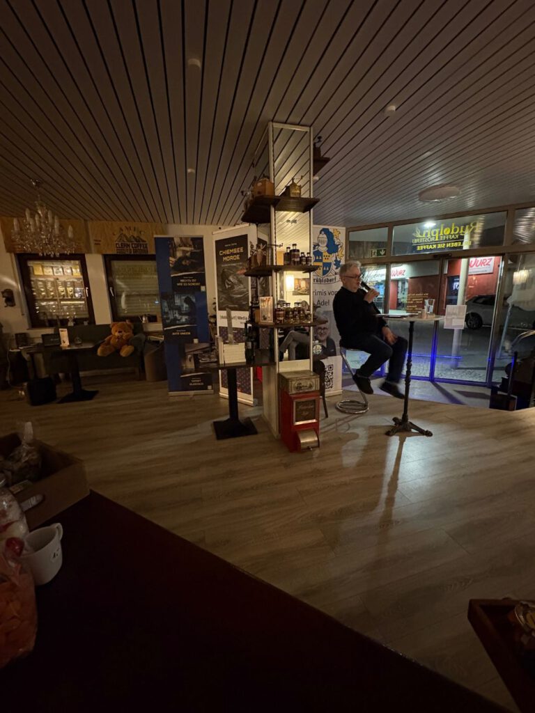 Manuela Rudolph, Walther Stonet und eine begeisterte Zuhörerschaft feiern den Krimi Chiemsee Morde in der Metzinger Kaffeerösterei